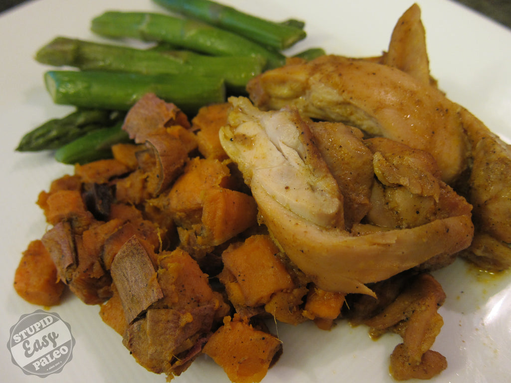Roasted abodabo chicken with asparagus and country yams