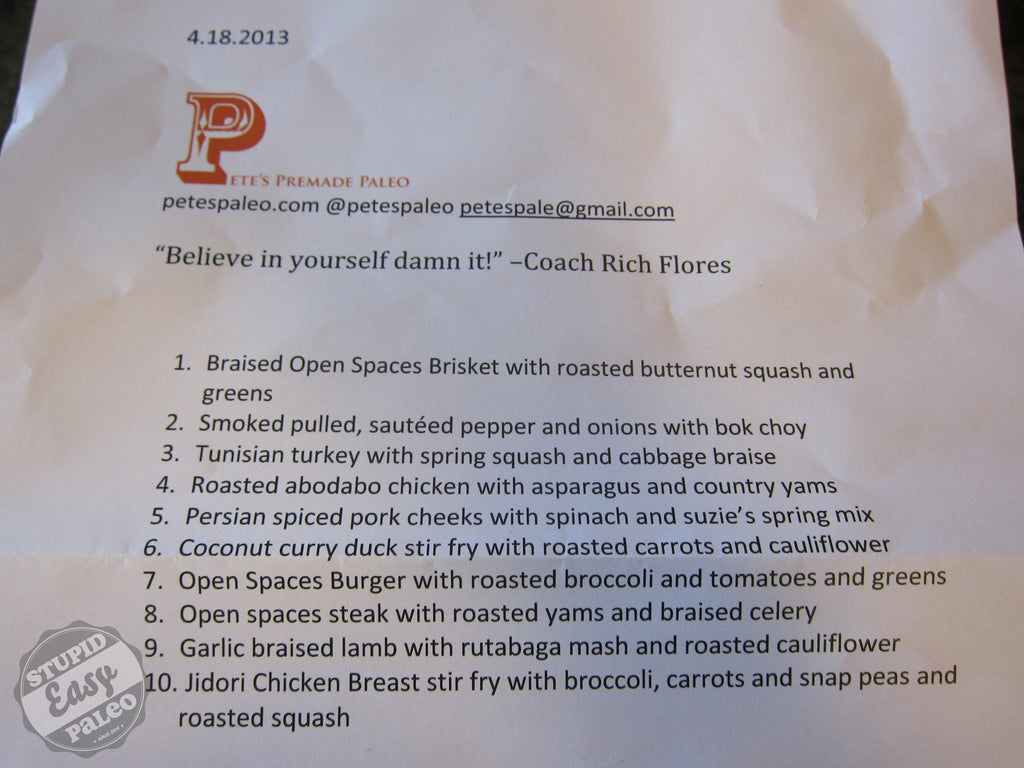 Review by Stupid Easy Paleo Imagine a Paleo chef cooking you plates of amazing food each week - a variety of high-quality, sustainably-raised meats, locally-sourced vegetables, scrumptious snacks, and the most amazing bacon you've ever tasted - and all you'd have to do is place your order online. Go ahead. I'll wait as you wipe the drool off your keyboard. If you're in California, this daydream can actually be a reality, and Pete's Paleo - owned by Pete and Sarah Servold - is the company making it happen. They ship all over the state or deliver to different local businesses here in the San Diego area. For those of you outside California, don't despair! Pete's is planning to expand into a national program soon. Score! Watch their website for more details, and get on their mailing list. Back to the food...and let me tell you, it's delicious. Ever since Pete's started offering delivery to Invictus Fitness, the CrossFit gym I train it, I'd been curious about ordering. I love to cook and create recipes of my own, but sometimes even I need a break! Having someone cook for me - especially awesome Paleo food - is rare, so I decided to treat myself with an order from Pete's. That's right...some girls pamper themselves with new clothes or a mani-pedi, but I do it with food! It couldn't be easier to order: after a few clicks on their site, my order was placed and all I had to do was wait. Pete's lets you customize your order by selecting the number of meals (5 or 10 plus snacks), or adding extra veggies or extra protein for an additional charge.