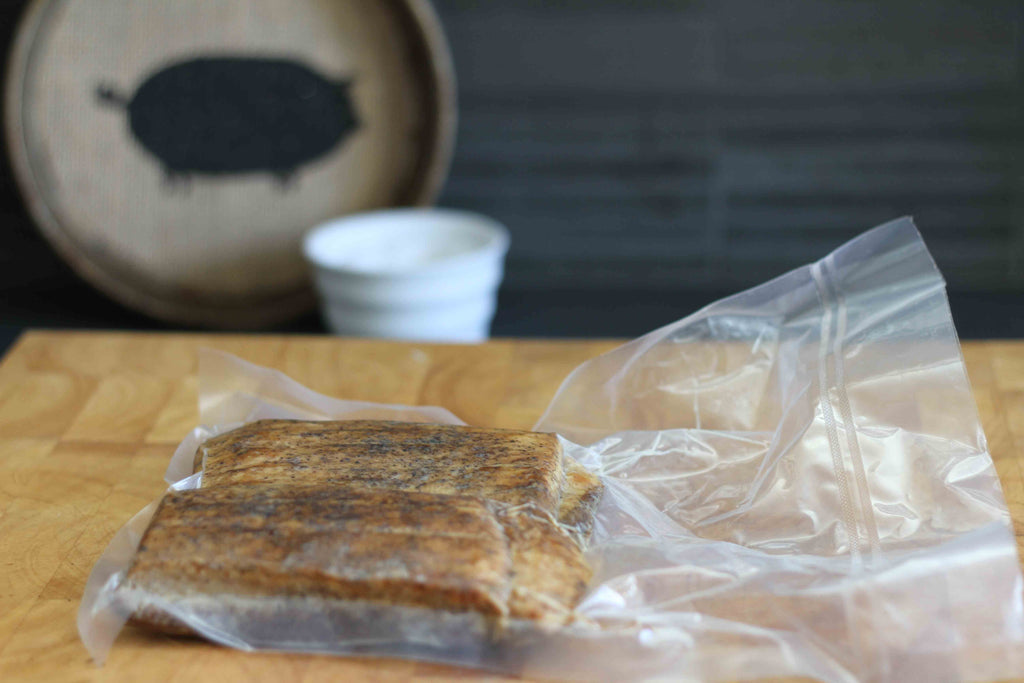 What are you waiting for?! Rip open the vacuum sealed bag and begin to slice the bacon along either side. Lengthwise for traditional bacon or width-wise for snack sized bites!