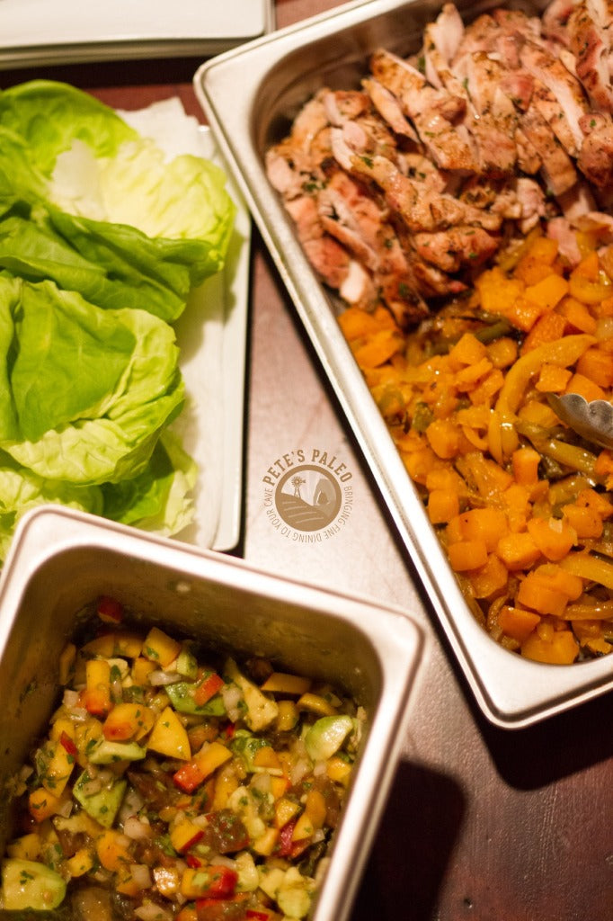 Lime, Garlic Wood Grilled Chicken Thighs with sautéed peppers, roasted butternut squash and a nectarine avocado salsa with butter lettuce wraps